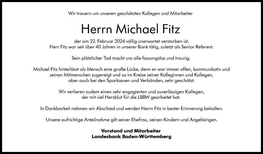 Hier finden Sie alle Traueranzeigen aus der Zeitung, die bisher für Michael Fitz erschienen sind. Weitere Traueranzeigen, die in der Zeitung erscheinen, werden hier ebenfalls aufgelistet