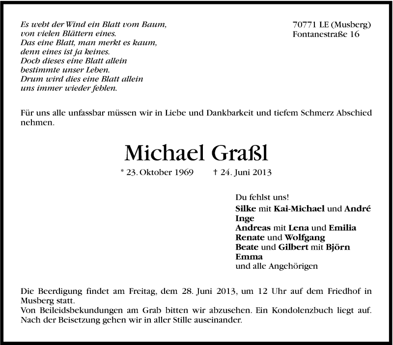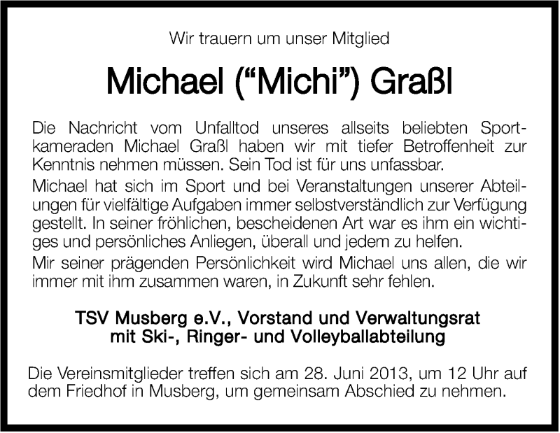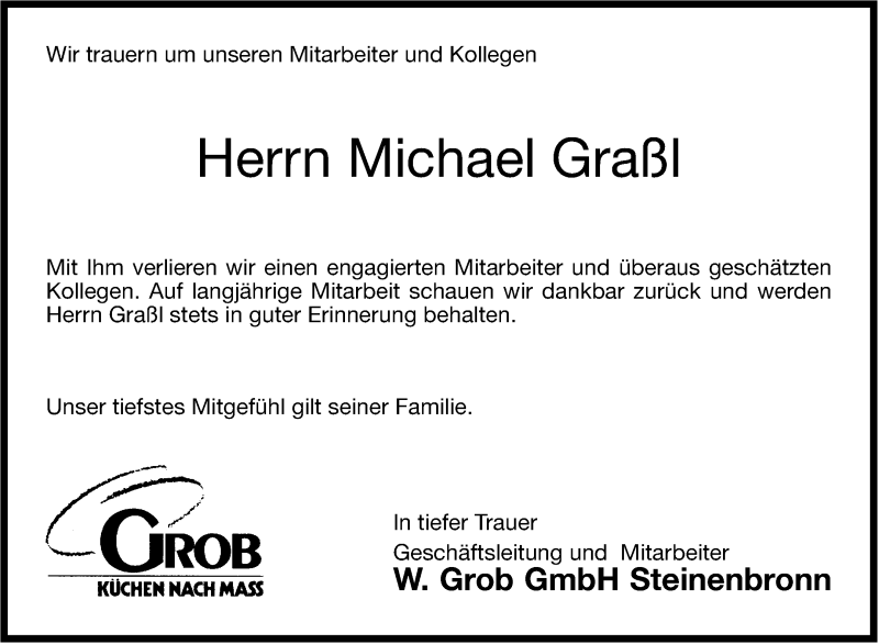 Hier finden Sie alle Traueranzeigen aus der Zeitung, die bisher für Michael Graßl erschienen sind. Weitere Traueranzeigen, die in der Zeitung erscheinen, werden hier ebenfalls aufgelistet