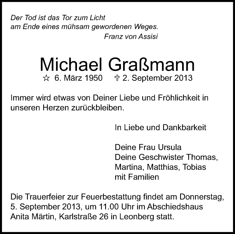 Hier finden Sie alle Traueranzeigen aus der Zeitung, die bisher für Michael Graßmann erschienen sind. Weitere Traueranzeigen, die in der Zeitung erscheinen, werden hier ebenfalls aufgelistet
