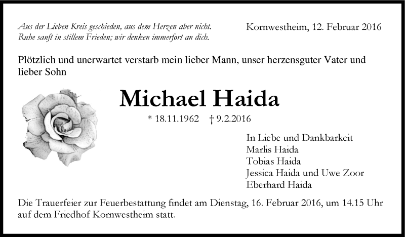 Hier finden Sie alle Traueranzeigen aus der Zeitung, die bisher für Michael Haida erschienen sind. Weitere Traueranzeigen, die in der Zeitung erscheinen, werden hier ebenfalls aufgelistet