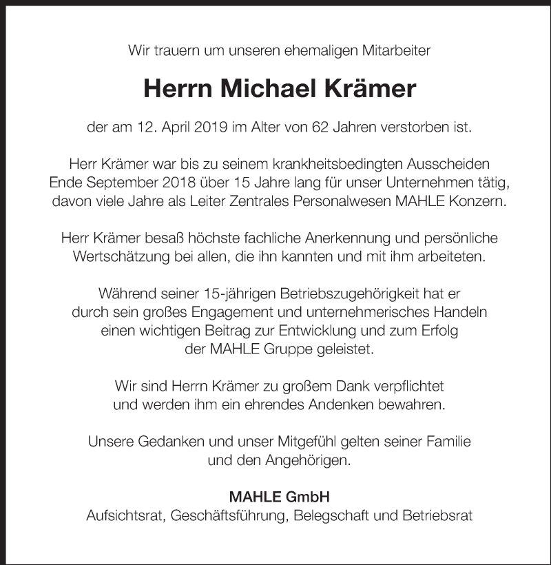 Hier finden Sie alle Traueranzeigen aus der Zeitung, die bisher für Michael Krämer erschienen sind. Weitere Traueranzeigen, die in der Zeitung erscheinen, werden hier ebenfalls aufgelistet