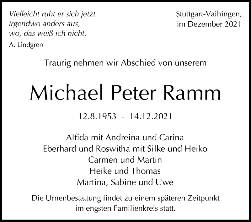 Hier finden Sie alle Traueranzeigen aus der Zeitung, die bisher für Michael Peter Ramm erschienen sind. Weitere Traueranzeigen, die in der Zeitung erscheinen, werden hier ebenfalls aufgelistet