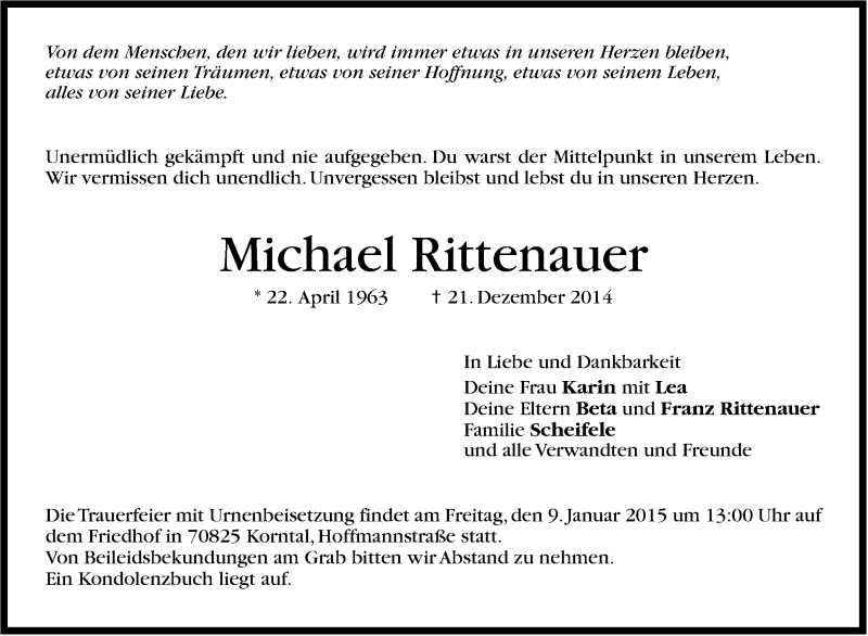 Hier finden Sie alle Traueranzeigen aus der Zeitung, die bisher für Michael Rittenauer erschienen sind. Weitere Traueranzeigen, die in der Zeitung erscheinen, werden hier ebenfalls aufgelistet