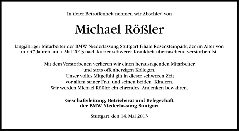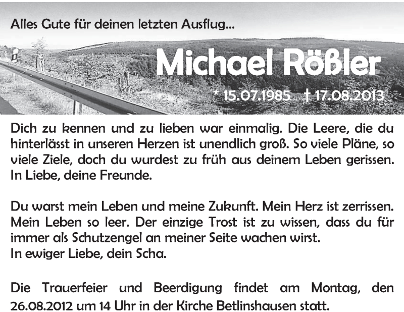 Hier finden Sie alle Traueranzeigen aus der Zeitung, die bisher für Michael Rößler erschienen sind. Weitere Traueranzeigen, die in der Zeitung erscheinen, werden hier ebenfalls aufgelistet