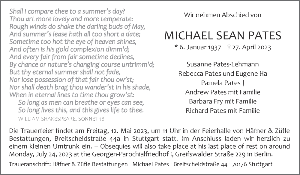 Hier finden Sie alle Traueranzeigen aus der Zeitung, die bisher für Michael Sean Pates erschienen sind. Weitere Traueranzeigen, die in der Zeitung erscheinen, werden hier ebenfalls aufgelistet