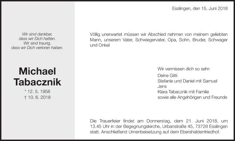 Hier finden Sie alle Traueranzeigen aus der Zeitung, die bisher für Michael Tabacznik erschienen sind. Weitere Traueranzeigen, die in der Zeitung erscheinen, werden hier ebenfalls aufgelistet