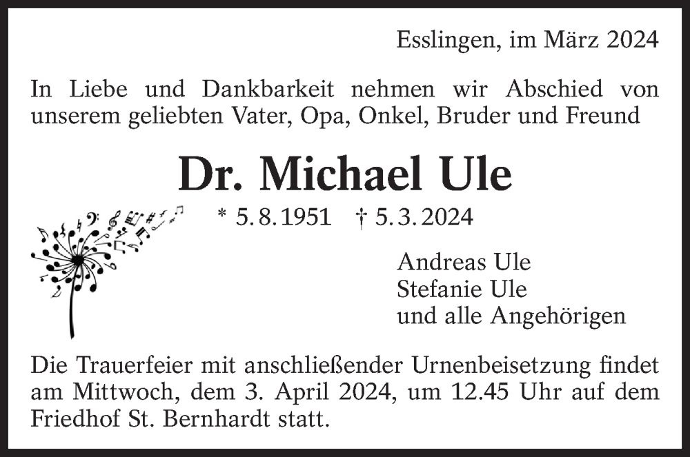 Hier finden Sie alle Traueranzeigen aus der Zeitung, die bisher für Michael Ule erschienen sind. Weitere Traueranzeigen, die in der Zeitung erscheinen, werden hier ebenfalls aufgelistet