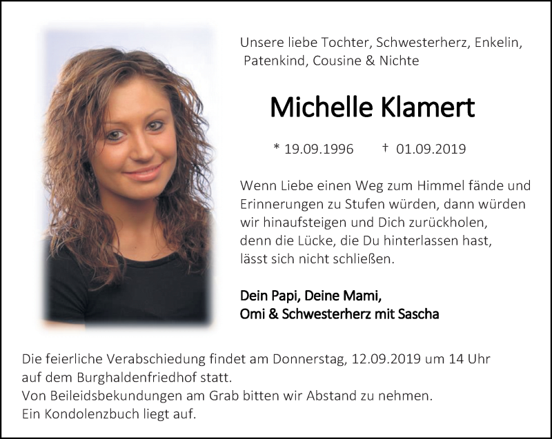 Hier finden Sie alle Traueranzeigen aus der Zeitung, die bisher für Michelle Klamert erschienen sind. Weitere Traueranzeigen, die in der Zeitung erscheinen, werden hier ebenfalls aufgelistet
