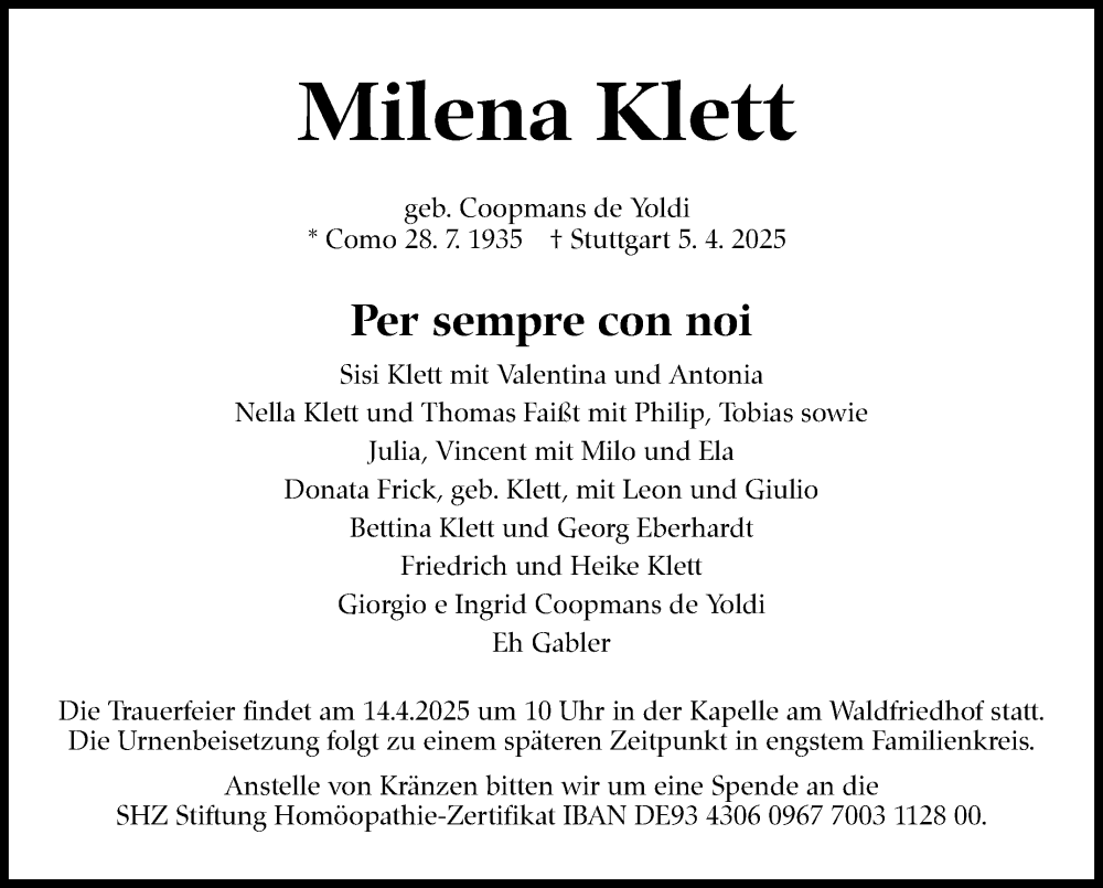 Hier finden Sie alle Traueranzeigen aus der Zeitung, die bisher für Milena Klett erschienen sind. Weitere Traueranzeigen, die in der Zeitung erscheinen, werden hier ebenfalls aufgelistet