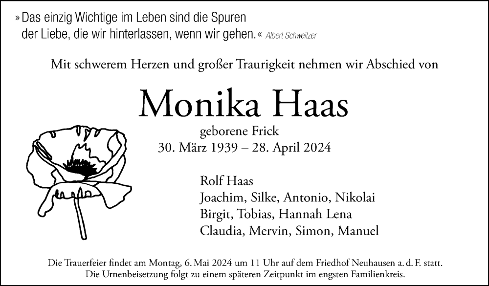 Hier finden Sie alle Traueranzeigen aus der Zeitung, die bisher für Monika Haas erschienen sind. Weitere Traueranzeigen, die in der Zeitung erscheinen, werden hier ebenfalls aufgelistet