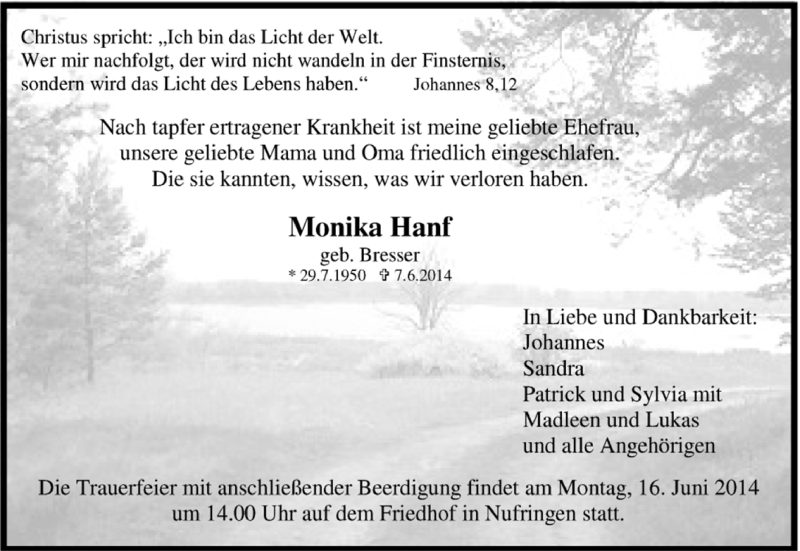 Hier finden Sie alle Traueranzeigen aus der Zeitung, die bisher für Monika Hanf erschienen sind. Weitere Traueranzeigen, die in der Zeitung erscheinen, werden hier ebenfalls aufgelistet