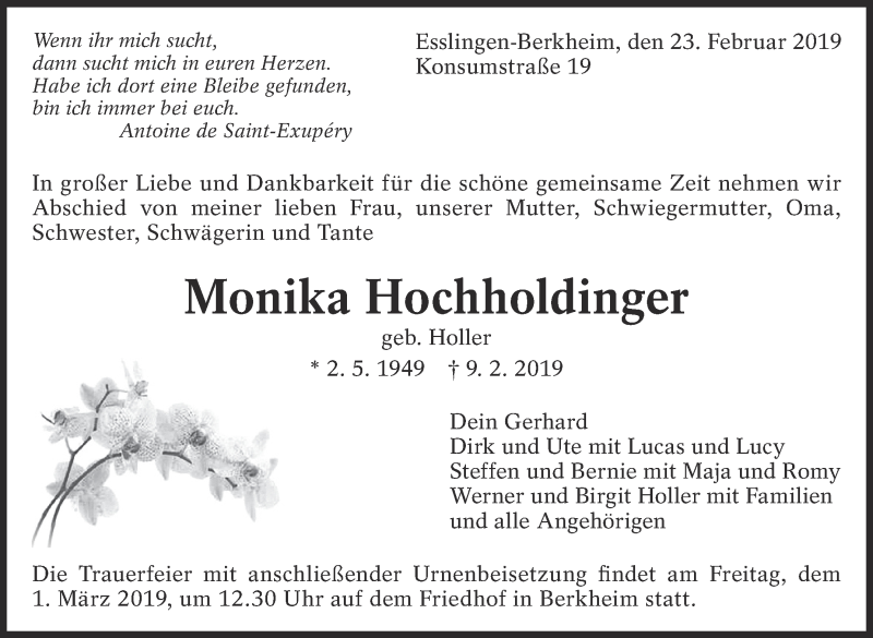 Hier finden Sie alle Traueranzeigen aus der Zeitung, die bisher für Monika Hochholdinger erschienen sind. Weitere Traueranzeigen, die in der Zeitung erscheinen, werden hier ebenfalls aufgelistet