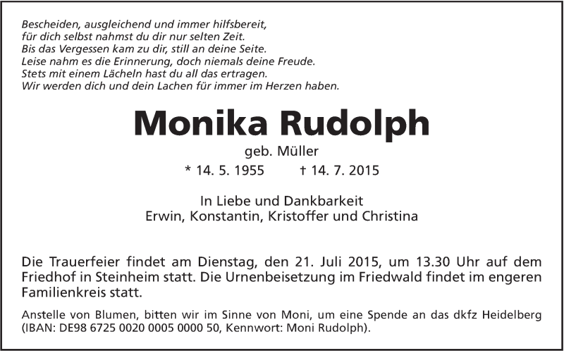 Hier finden Sie alle Traueranzeigen aus der Zeitung, die bisher für Monika Rudolph erschienen sind. Weitere Traueranzeigen, die in der Zeitung erscheinen, werden hier ebenfalls aufgelistet