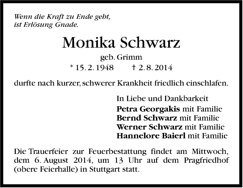 Hier finden Sie alle Traueranzeigen aus der Zeitung, die bisher für Monika Schwarz erschienen sind. Weitere Traueranzeigen, die in der Zeitung erscheinen, werden hier ebenfalls aufgelistet