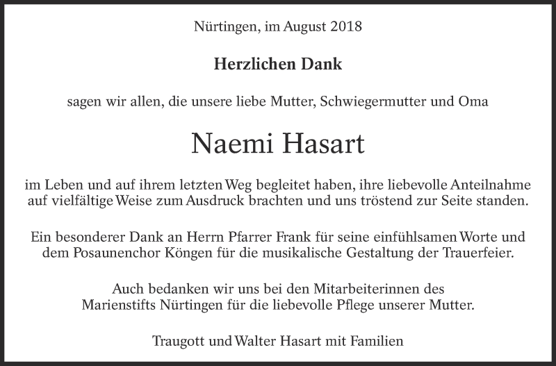 Hier finden Sie alle Traueranzeigen aus der Zeitung, die bisher für Naemi Hasart erschienen sind. Weitere Traueranzeigen, die in der Zeitung erscheinen, werden hier ebenfalls aufgelistet