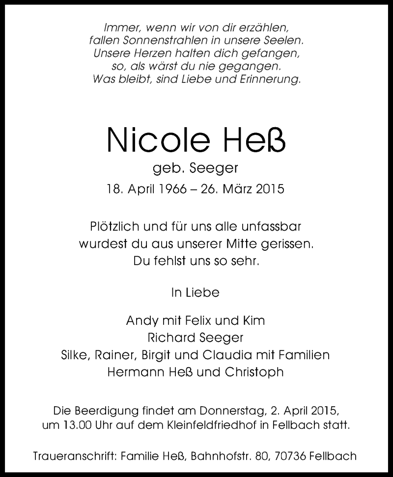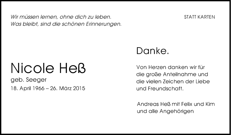 Hier finden Sie alle Traueranzeigen aus der Zeitung, die bisher für Nicole Heß erschienen sind. Weitere Traueranzeigen, die in der Zeitung erscheinen, werden hier ebenfalls aufgelistet