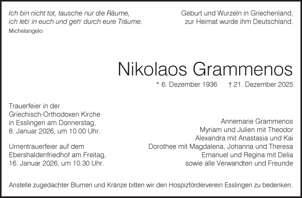 Hier finden Sie alle Traueranzeigen aus der Zeitung, die bisher für Nikolaos Grammenos erschienen sind. Weitere Traueranzeigen, die in der Zeitung erscheinen, werden hier ebenfalls aufgelistet