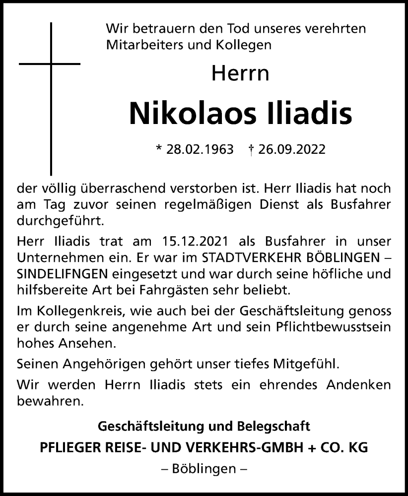 Hier finden Sie alle Traueranzeigen aus der Zeitung, die bisher für Nikolaos Iliadis erschienen sind. Weitere Traueranzeigen, die in der Zeitung erscheinen, werden hier ebenfalls aufgelistet