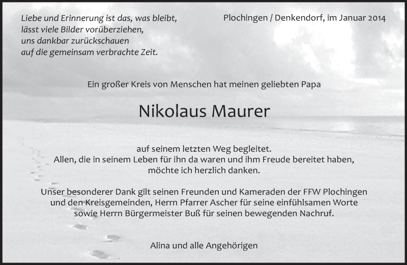 Hier finden Sie alle Traueranzeigen aus der Zeitung, die bisher für Nikolaus Maurer erschienen sind. Weitere Traueranzeigen, die in der Zeitung erscheinen, werden hier ebenfalls aufgelistet