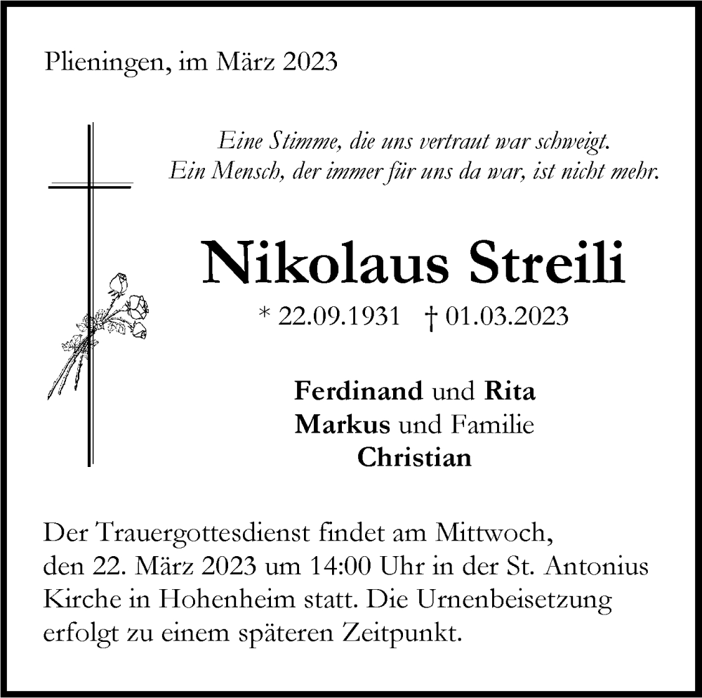 Hier finden Sie alle Traueranzeigen aus der Zeitung, die bisher für Nikolaus Streili erschienen sind. Weitere Traueranzeigen, die in der Zeitung erscheinen, werden hier ebenfalls aufgelistet