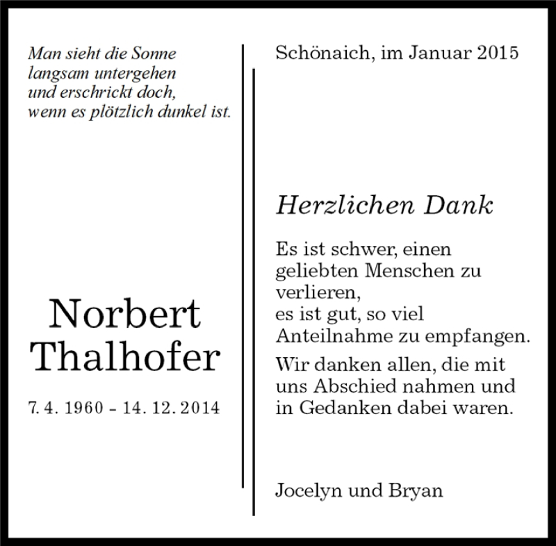 Hier finden Sie alle Traueranzeigen aus der Zeitung, die bisher für Norbert Thalhofer erschienen sind. Weitere Traueranzeigen, die in der Zeitung erscheinen, werden hier ebenfalls aufgelistet