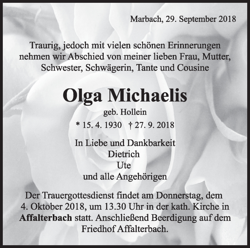 Hier finden Sie alle Traueranzeigen aus der Zeitung, die bisher für Olga Michaelis erschienen sind. Weitere Traueranzeigen, die in der Zeitung erscheinen, werden hier ebenfalls aufgelistet