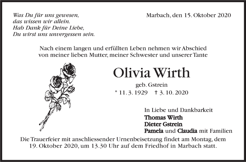 Hier finden Sie alle Traueranzeigen aus der Zeitung, die bisher für Olivia Wirth erschienen sind. Weitere Traueranzeigen, die in der Zeitung erscheinen, werden hier ebenfalls aufgelistet