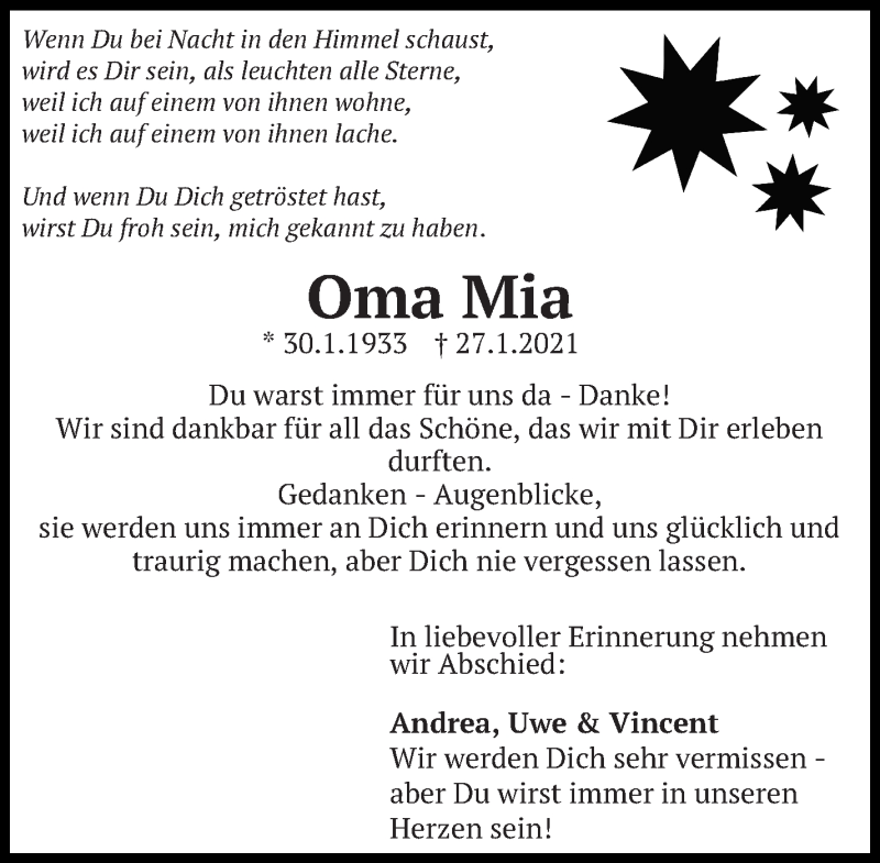 Hier finden Sie alle Traueranzeigen aus der Zeitung, die bisher für Oma Mia erschienen sind. Weitere Traueranzeigen, die in der Zeitung erscheinen, werden hier ebenfalls aufgelistet