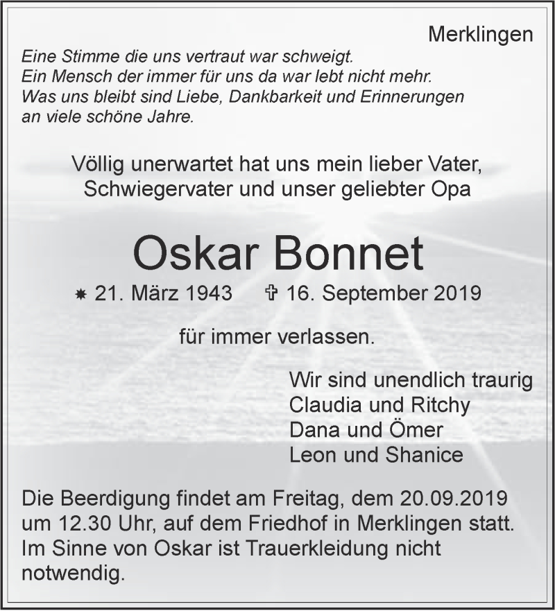 Hier finden Sie alle Traueranzeigen aus der Zeitung, die bisher für Oskar Bonnet erschienen sind. Weitere Traueranzeigen, die in der Zeitung erscheinen, werden hier ebenfalls aufgelistet