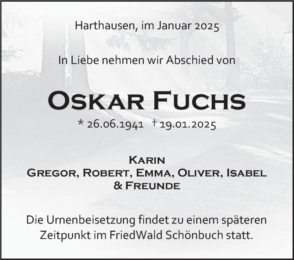 Hier finden Sie alle Traueranzeigen aus der Zeitung, die bisher für Oskar Fuchs erschienen sind. Weitere Traueranzeigen, die in der Zeitung erscheinen, werden hier ebenfalls aufgelistet