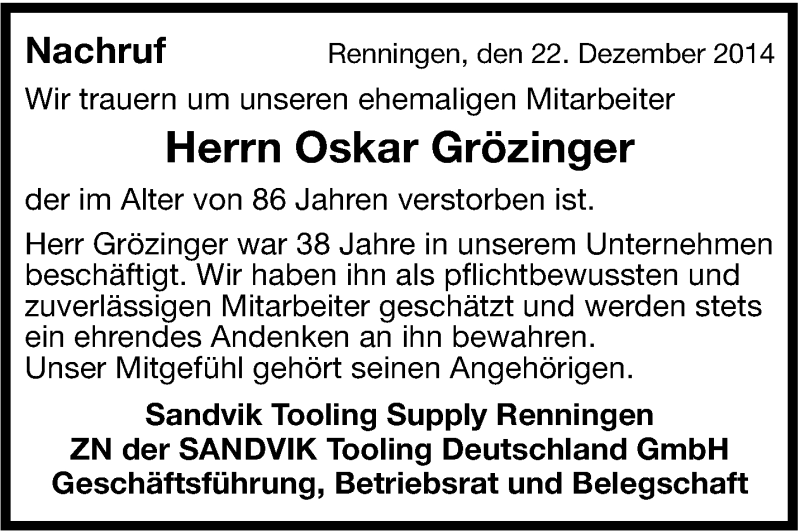 Hier finden Sie alle Traueranzeigen aus der Zeitung, die bisher für Oskar Grözinger erschienen sind. Weitere Traueranzeigen, die in der Zeitung erscheinen, werden hier ebenfalls aufgelistet
