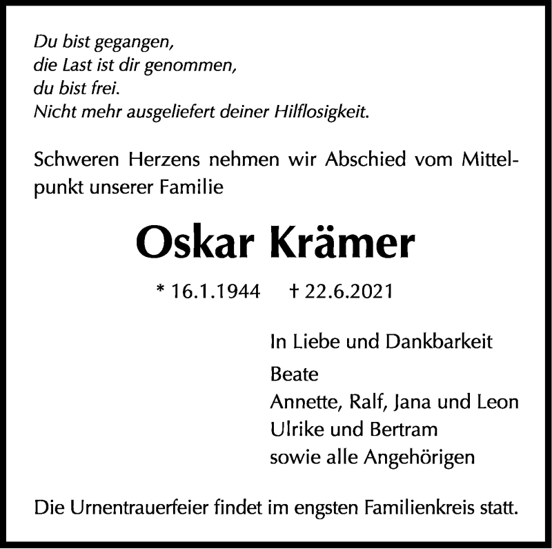 Hier finden Sie alle Traueranzeigen aus der Zeitung, die bisher für Oskar Krämer erschienen sind. Weitere Traueranzeigen, die in der Zeitung erscheinen, werden hier ebenfalls aufgelistet