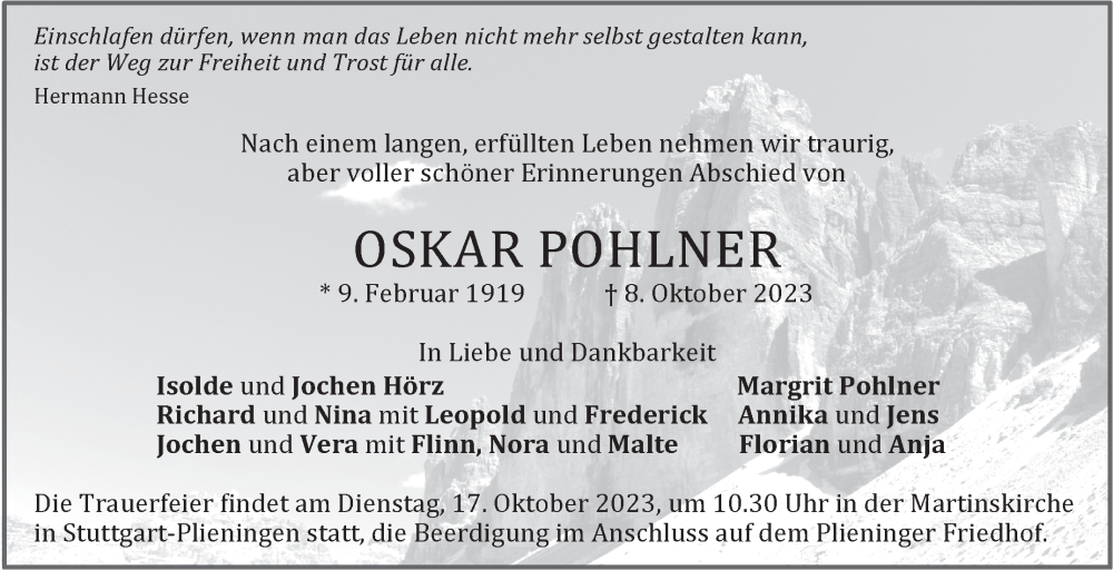 Hier finden Sie alle Traueranzeigen aus der Zeitung, die bisher für Oskar Pohlner erschienen sind. Weitere Traueranzeigen, die in der Zeitung erscheinen, werden hier ebenfalls aufgelistet