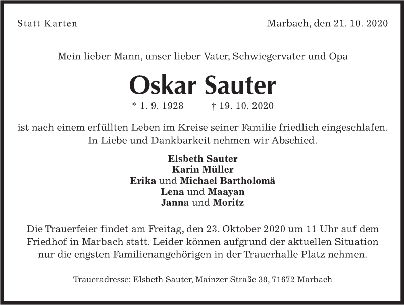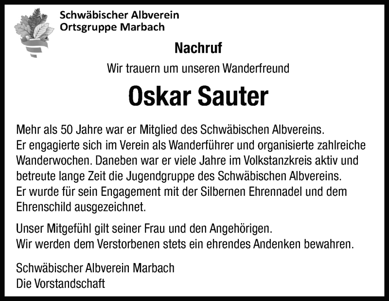 Hier finden Sie alle Traueranzeigen aus der Zeitung, die bisher für Oskar Sauter erschienen sind. Weitere Traueranzeigen, die in der Zeitung erscheinen, werden hier ebenfalls aufgelistet