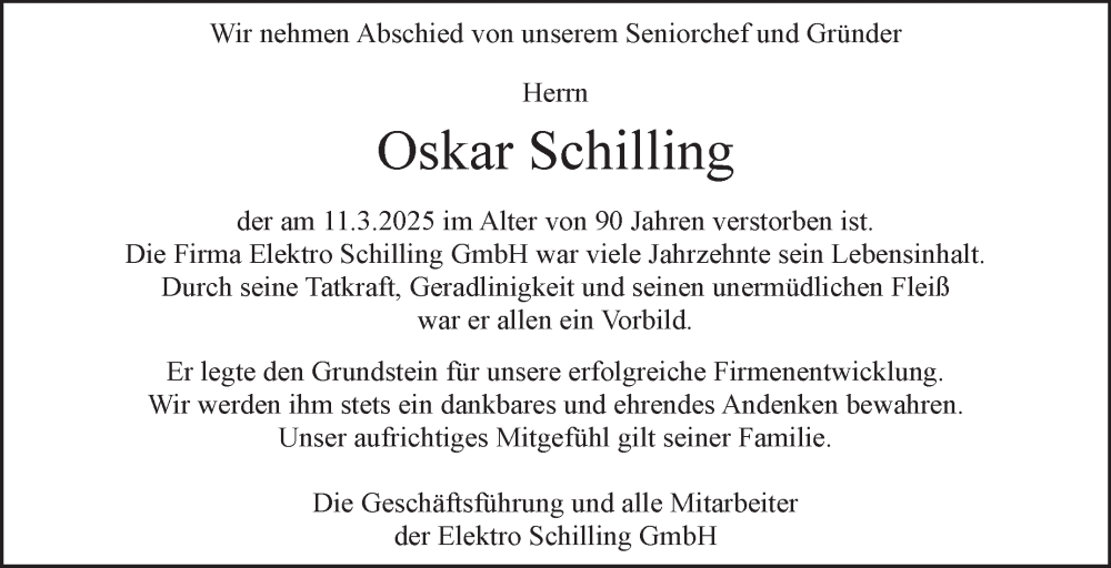Hier finden Sie alle Traueranzeigen aus der Zeitung, die bisher für Oskar Schilling erschienen sind. Weitere Traueranzeigen, die in der Zeitung erscheinen, werden hier ebenfalls aufgelistet