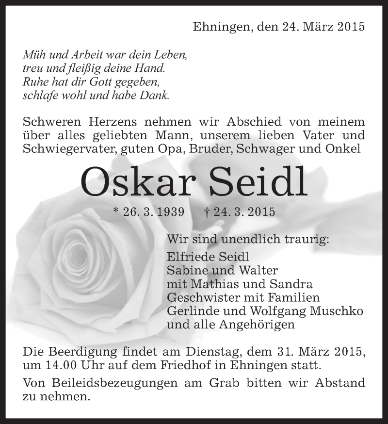 Hier finden Sie alle Traueranzeigen aus der Zeitung, die bisher für Oskar Seidl erschienen sind. Weitere Traueranzeigen, die in der Zeitung erscheinen, werden hier ebenfalls aufgelistet