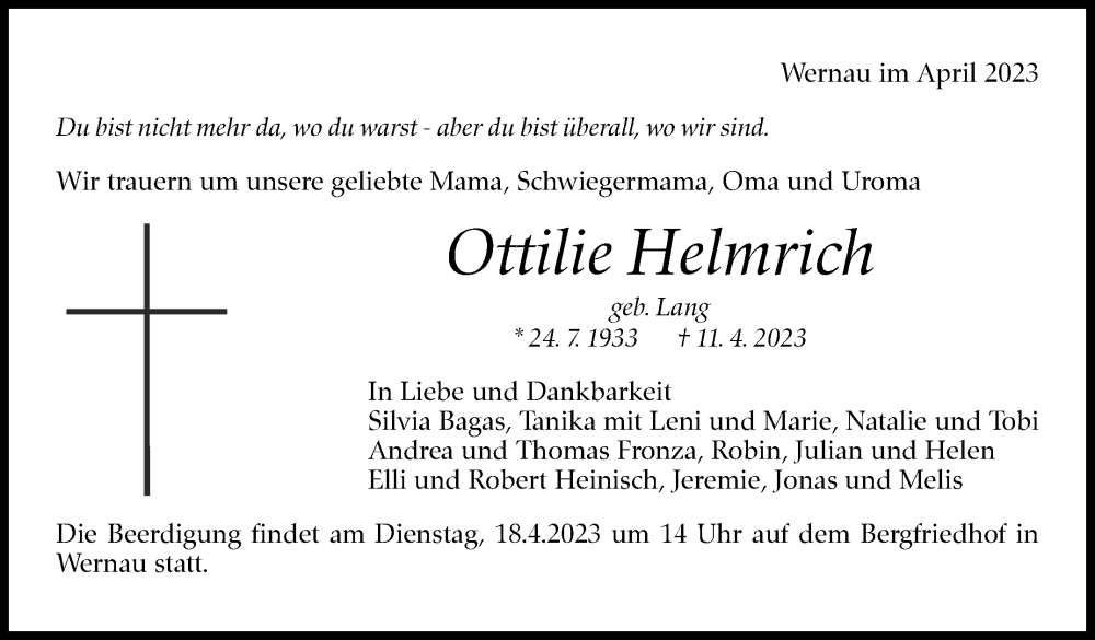 Hier finden Sie alle Traueranzeigen aus der Zeitung, die bisher für Ottilie Helmrich erschienen sind. Weitere Traueranzeigen, die in der Zeitung erscheinen, werden hier ebenfalls aufgelistet