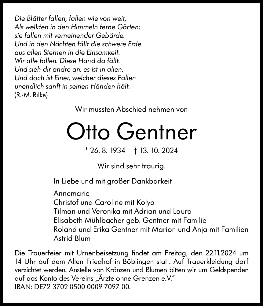 Hier finden Sie alle Traueranzeigen aus der Zeitung, die bisher für Otto Gentner erschienen sind. Weitere Traueranzeigen, die in der Zeitung erscheinen, werden hier ebenfalls aufgelistet