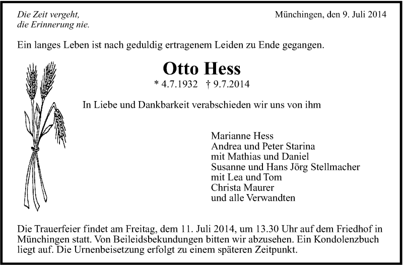 Hier finden Sie alle Traueranzeigen aus der Zeitung, die bisher für Otto Hess erschienen sind. Weitere Traueranzeigen, die in der Zeitung erscheinen, werden hier ebenfalls aufgelistet