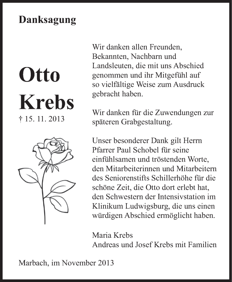 Hier finden Sie alle Traueranzeigen aus der Zeitung, die bisher für Otto Krebs erschienen sind. Weitere Traueranzeigen, die in der Zeitung erscheinen, werden hier ebenfalls aufgelistet