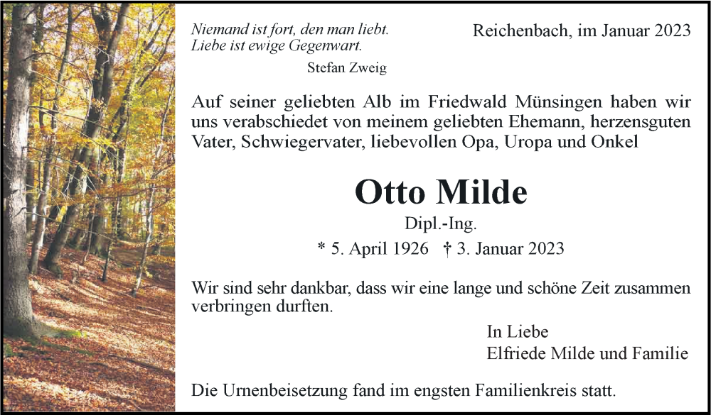 Hier finden Sie alle Traueranzeigen aus der Zeitung, die bisher für Otto Milde erschienen sind. Weitere Traueranzeigen, die in der Zeitung erscheinen, werden hier ebenfalls aufgelistet