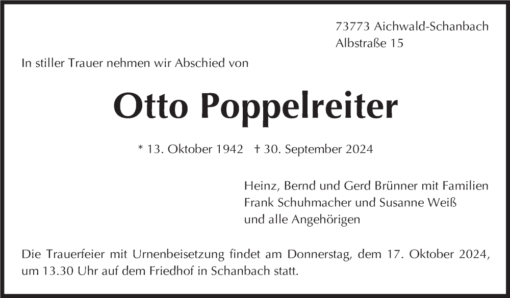 Hier finden Sie alle Traueranzeigen aus der Zeitung, die bisher für Otto Poppelreiter erschienen sind. Weitere Traueranzeigen, die in der Zeitung erscheinen, werden hier ebenfalls aufgelistet