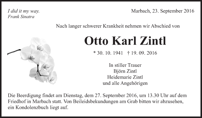 Hier finden Sie alle Traueranzeigen aus der Zeitung, die bisher für Otto Zintl erschienen sind. Weitere Traueranzeigen, die in der Zeitung erscheinen, werden hier ebenfalls aufgelistet
