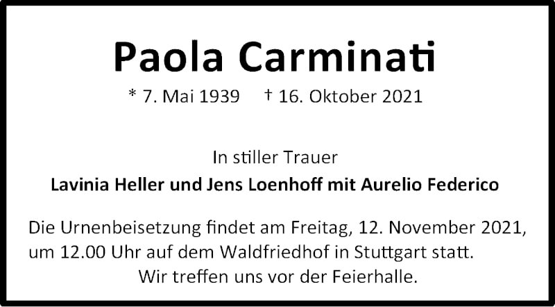 Hier finden Sie alle Traueranzeigen aus der Zeitung, die bisher für Paola Carminati erschienen sind. Weitere Traueranzeigen, die in der Zeitung erscheinen, werden hier ebenfalls aufgelistet