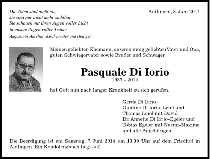 Hier finden Sie alle Traueranzeigen aus der Zeitung, die bisher für Pasquale Di Iorio erschienen sind. Weitere Traueranzeigen, die in der Zeitung erscheinen, werden hier ebenfalls aufgelistet