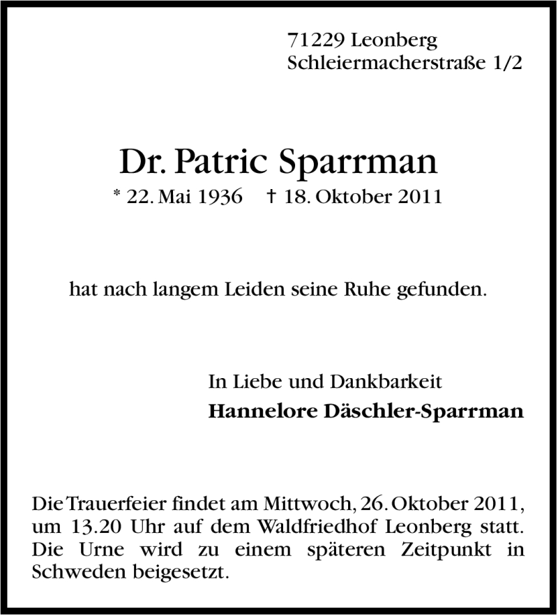 Hier finden Sie alle Traueranzeigen aus der Zeitung, die bisher für Patric Sparrman erschienen sind. Weitere Traueranzeigen, die in der Zeitung erscheinen, werden hier ebenfalls aufgelistet