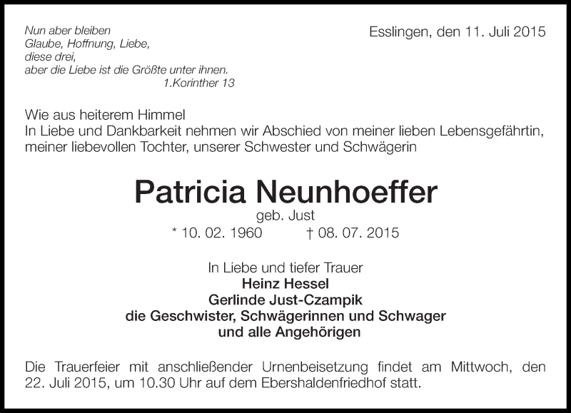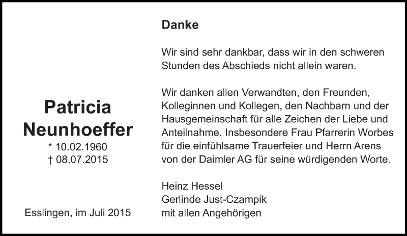 Hier finden Sie alle Traueranzeigen aus der Zeitung, die bisher für Patricia Neunhoeffer erschienen sind. Weitere Traueranzeigen, die in der Zeitung erscheinen, werden hier ebenfalls aufgelistet