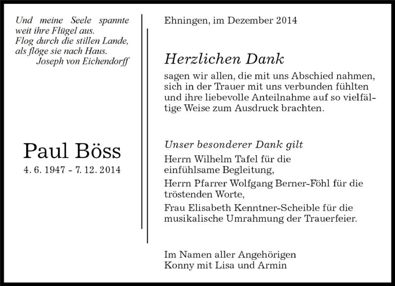 Hier finden Sie alle Traueranzeigen aus der Zeitung, die bisher für Paul Böss erschienen sind. Weitere Traueranzeigen, die in der Zeitung erscheinen, werden hier ebenfalls aufgelistet