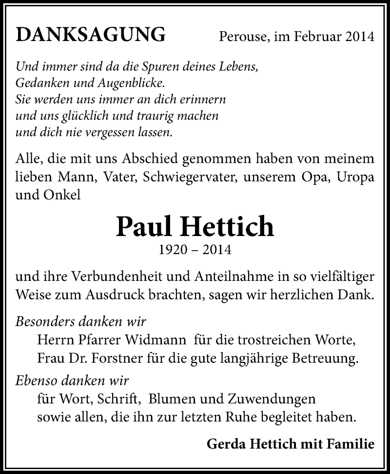 Hier finden Sie alle Traueranzeigen aus der Zeitung, die bisher für Paul Hettich erschienen sind. Weitere Traueranzeigen, die in der Zeitung erscheinen, werden hier ebenfalls aufgelistet