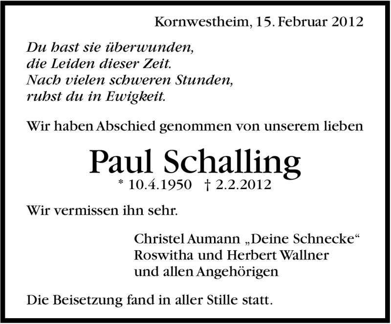 Hier finden Sie alle Traueranzeigen aus der Zeitung, die bisher für Paul Schilling erschienen sind. Weitere Traueranzeigen, die in der Zeitung erscheinen, werden hier ebenfalls aufgelistet